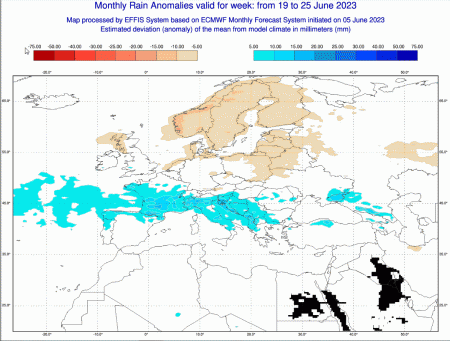 Infine, queste sono le anomalie pluviometriche attese in Italia nel medesimo periodo, tra il 19 e il 25 giugno: