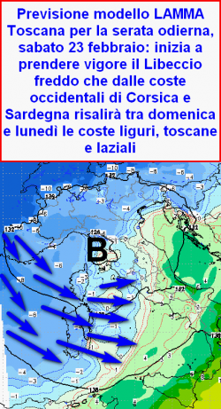 Con l’arrivo di domani, domenica 24 ma ancor più lunedì 25, ulteriore aria fredda andrà gettandosi sul Mediterraneo attraverso la valle del Rodano, rinnovando ancora condizioni di spiccata instabilità su diversi settori del Paese. Focalizzando la nostra attenzione alle regioni settentrionali e parte di quelle centrali, assisteremo ad un fenomeno decisamente raro di Libeccio freddo. Questo vento sarà associato a qualche precipitazione sparsa, regalando degli episodi nevosi a bassa quota anche su regioni climaticamente molto miti.