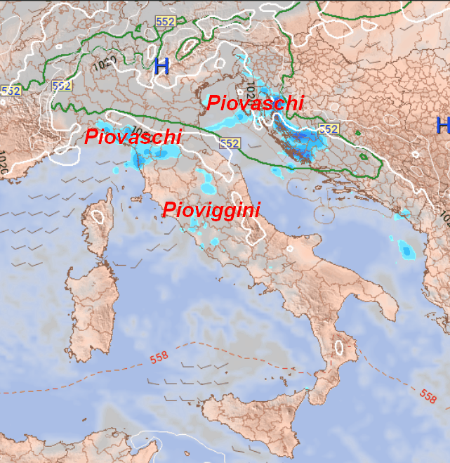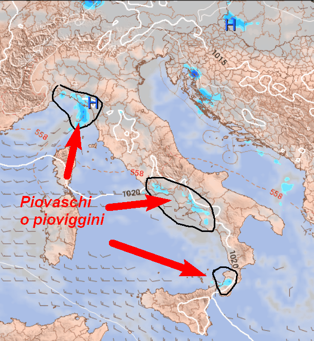 In secondo luogo avremo anche della nuvolosità bassa che interesserà segnatamente il versante tirrenico a parte del settentrione, stante un debole afflusso di aria molto umida dai quadranti occidentali. Vi saranno anche alcuni piovaschi o pioviggini.