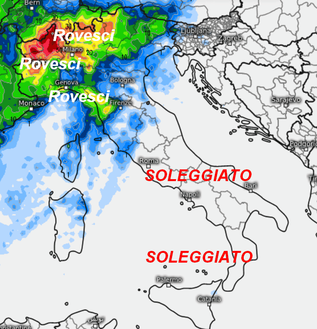 La seconda mappa mostra la sommatoria delle precipitazioni attese in Italia nella giornata di sabato 30 marzo: