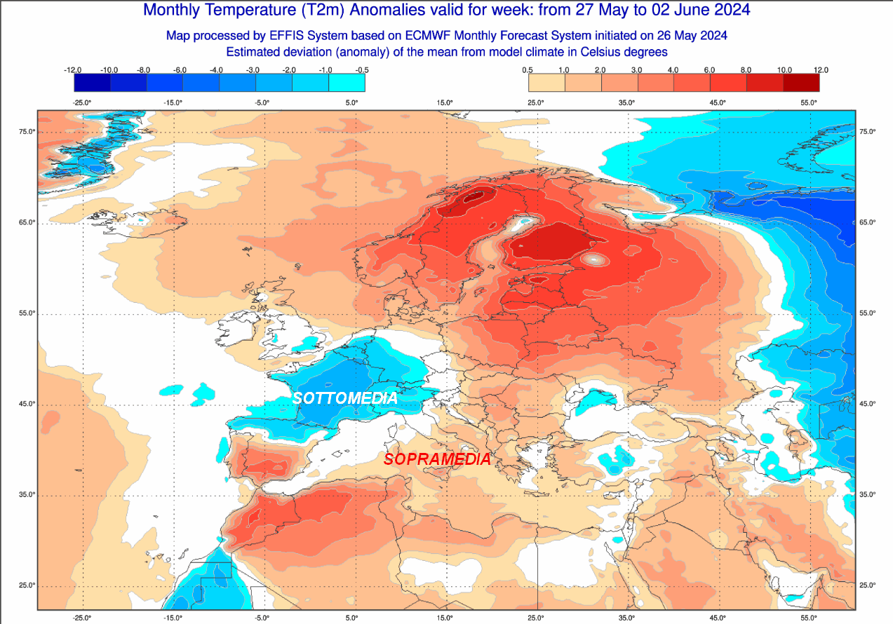 Iniziamo dalle anomalie termiche previste in Europa nel lasso temporale compreso tra il 27 maggio (oggi) e il 2 giugno: