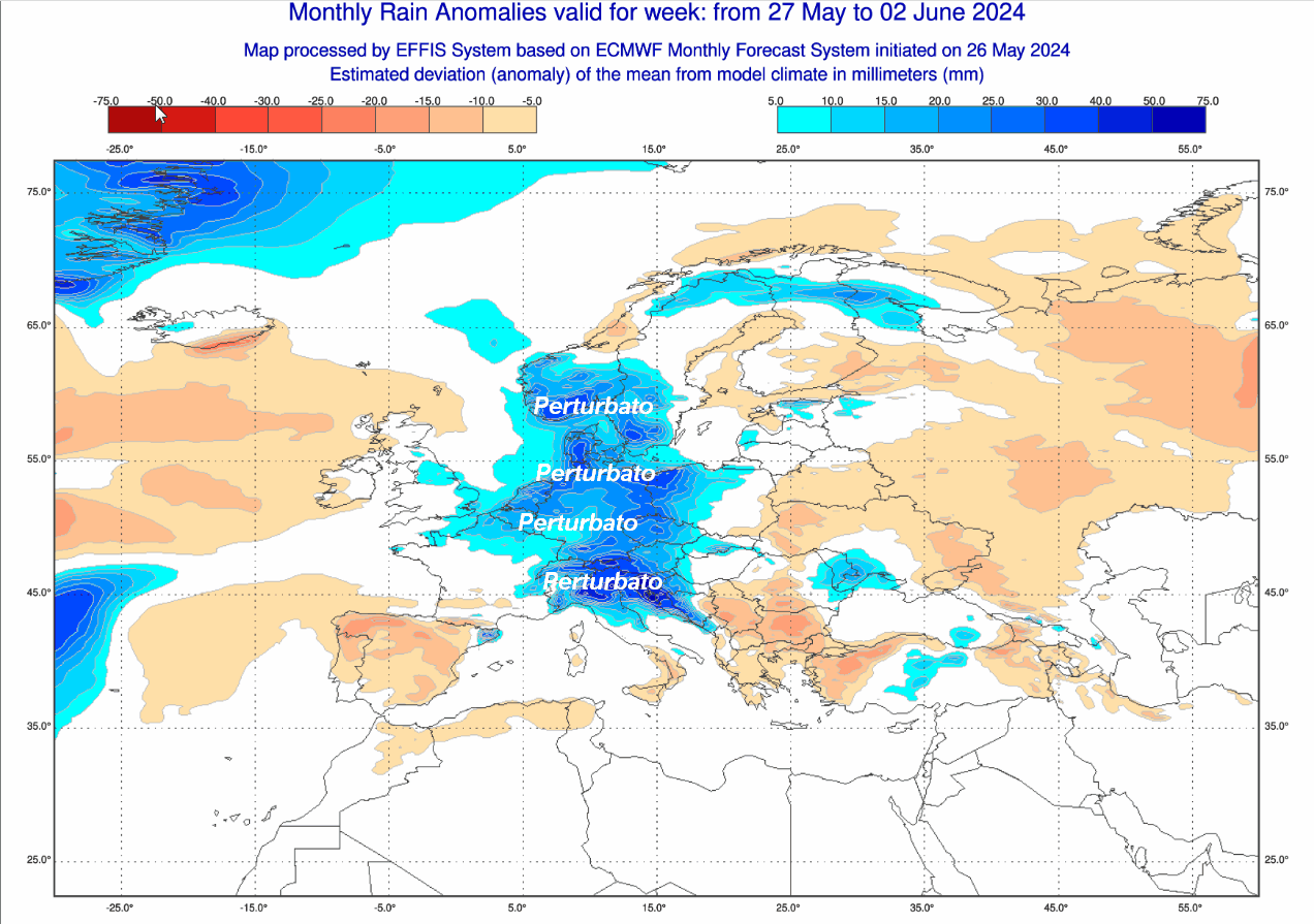 Sul fronte delle anomalie precipitative, ecco la mappa valida sempre per il medesimo lasso temporale, ovvero tra il 27 maggio e il 2 giugno: