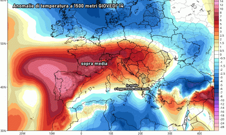 Il forte anticiclone si piazzerà tra Spagna, Francia e Italia imprimendo una forte subsidenza della colonna d’aria, ovvero favorirà lo schiacciamento dell’aria nei bassi strati che avrà come principale risultato un netto aumento della temperatura.