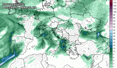 Proprio l’8 dicembre, giorno dell’Immacolata, la tendenza ad un peggioramento è ancora confermata dopo il nostro editoriale di qualche giorno fa. Un fronte proveniente da ovest potrebbe far piovere su Liguria, Lombardia, Toscana, Lazio, Emilia Romagna, Veneto, Trentino, Friuli, Sardegna, Campania, Umbria. Su questi settori potremmo assistere alle precipitazioni più presenti e modeste.