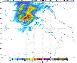 Nella mappa sopra, ecco le abbondanti precipitazioni previste al Nord-Ovest fra il pomeriggio e la serata di oggi: picchi di 50-80 millimetri (e oltre) previsti in particolare sulla Liguria