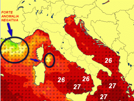 Osservate le temperature superficiali presenti all’interno del cerchio nero più grande, tra il Golfo del Leone e la Costa Azzurra. Non è un errore del radiometro, ma sono temperature realmente rilevate. Il mare al 9 di agosto ha raggiunto una temperatura superficiale di 15-16°; si tratta di valori che solitamente si registrano tra marzo e aprile!