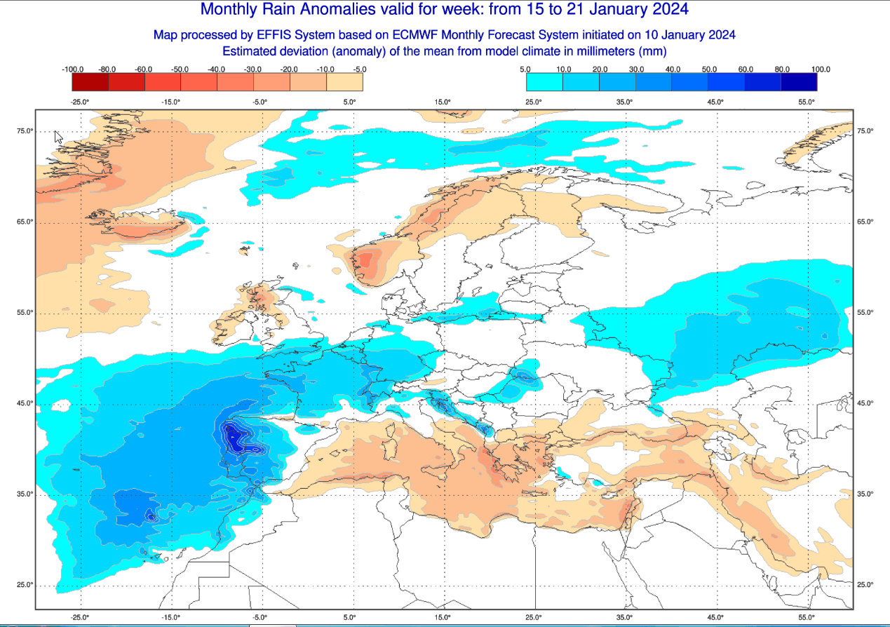 Sul fronte delle precipitazioni, queste sono le anomalie previste sempre per nel suddetto lasso temporale compreso tra il 15 e il 21 gennaio: