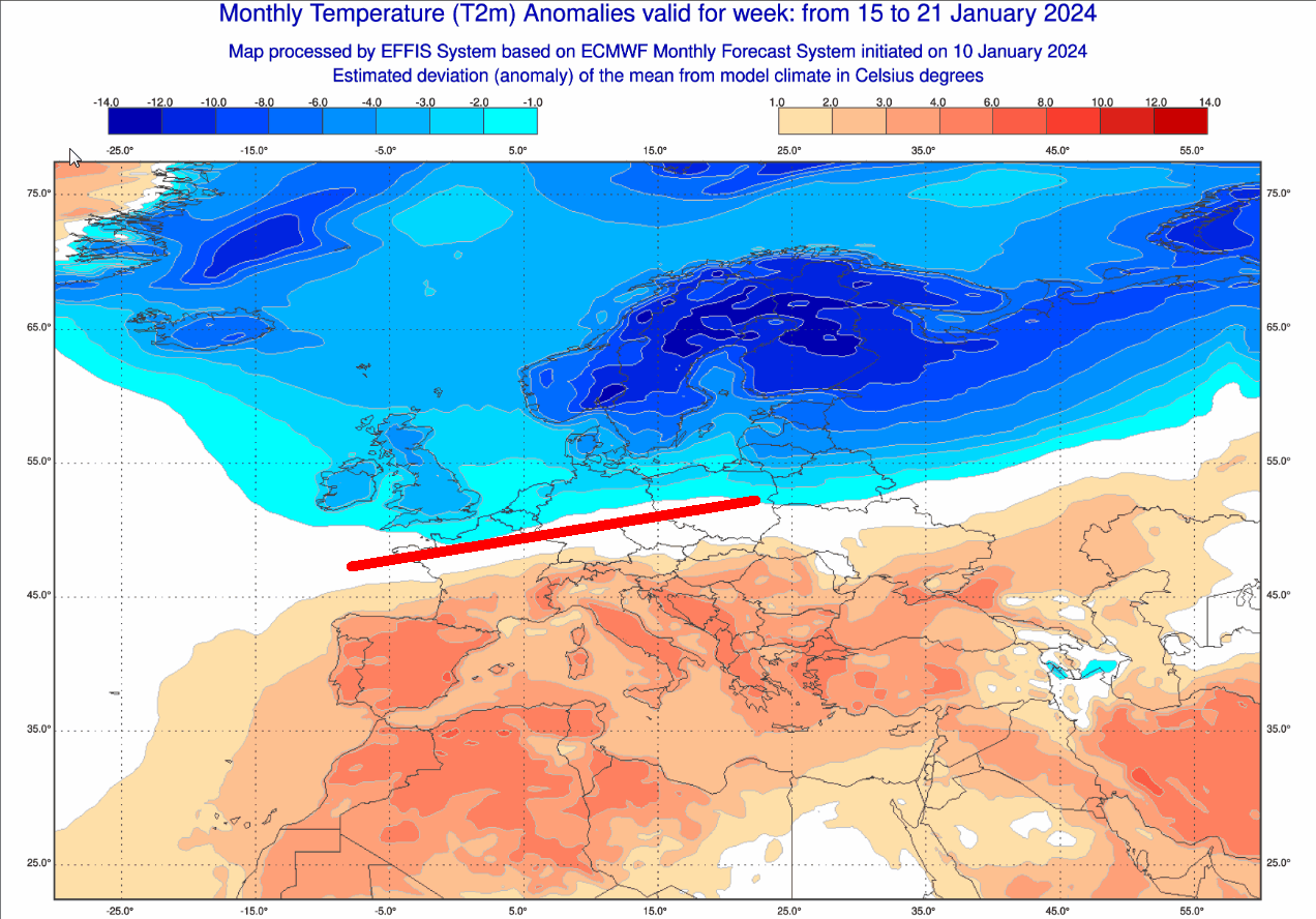 Avremo un Continente Europeo letteralmente diviso in due. A nord della linea rossa un sotto media termico quasi da primato, con punte tra i 12 ed i 15° inferiori alla media in sede scandinava. In altre parole, condizioni di GELO quasi estremo.