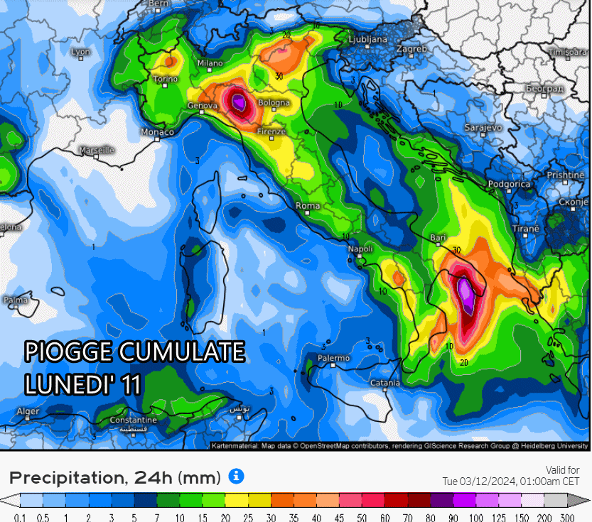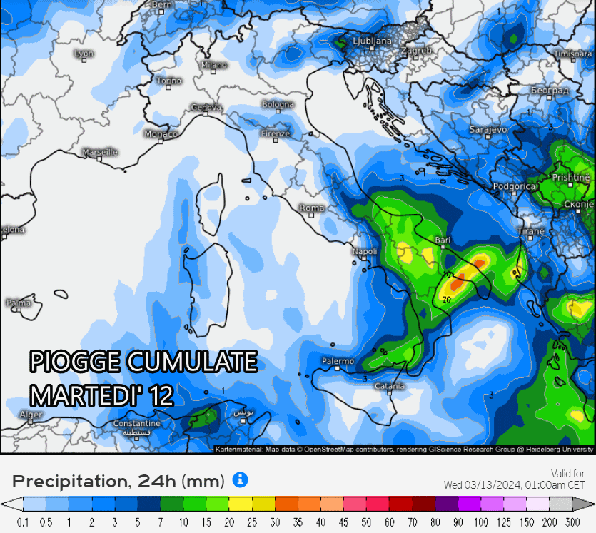 Eloquenti le piogge previste nelle sole 24 ore di lunedì 11 marzo: precipitazioni presenti su gran parte d’Italia, specie al mattino, con accumuli anche importanti su Emilia, Puglia, Veneto, Calabria. Si temono, inoltre, violenti temporali sul settore ionico ed il Salento.