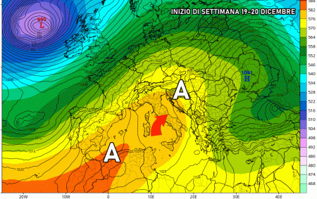 L’alta pressione avvolgerà l’Italia già ad inizio prossima settimana, tra 19 e 20 dicembre: tutta Italia si ritroverà sotto questo promontorio d’alta pressione piuttosto coriaceo e caratterizzato da geopotenziali tutt’altro che invernali. La massa d’aria sarà più alta rispetto a quel che dovrebbe essere a dicembre e ciò impedirà ogni tentativo di azione instabile lungo lo Stivale. Anzi, ci saranno le condizioni ideali per una forte subsidenza, ovvero per moti d’aria dall’alto verso il basso che risulterebbero davvero deleteri per le nostre montagne.