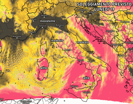 Con l’avvento dell’alta pressione torneranno fitti ed estesi banchi di nebbia su gran parte della pianura Padana, come si evince dal soleggiamento previsto lunedì 19 dicembre. Al nord possiamo notare un soleggiamento praticamente inesistente, mentre sarà abbastanza blando sulle coste tirreniche centro-settentrionali e l’Adriatico centrale per l’avvento di nubi basse. Andrà meglio al sud e le isole maggiori dove ci aspettiamo maggiori spazi soleggiati.