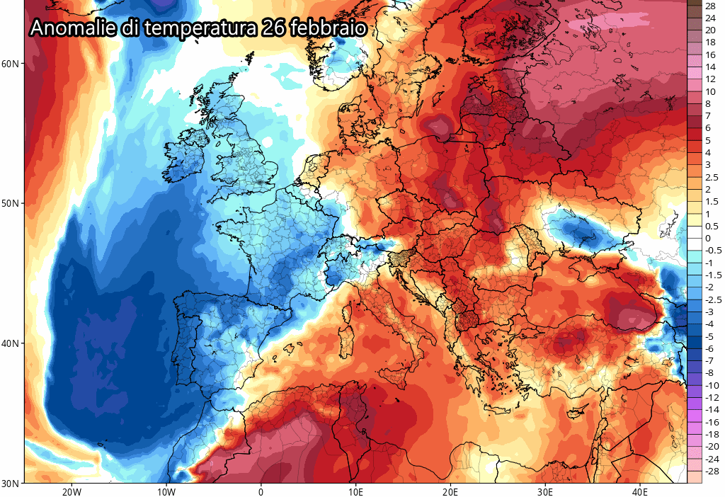 In questo articolo ci contreremo sull’ipotetico affondo freddo di inizio prossima settimana. Il modello americano GFS propone un’irruzione fredda sull’Europa occidentale, che inevitabilmente avrebbe effetti marcati anche in Italia. Tale affondo freddo potrebbe innescare la risalita, da sud, di imponenti masse tiepide e ricche di umidità: queste regalerebbero piogge diffuse su gran parte d’Italia, ma al tempo stesso anche un sensibile aumento delle temperature su tre-quarti della penisola a causa dei venti di scirocco e libeccio. Difatti si possono notare le anomalie previste il 26 febbraio, di circa 1-3°C oltre la media sul centro-sud.