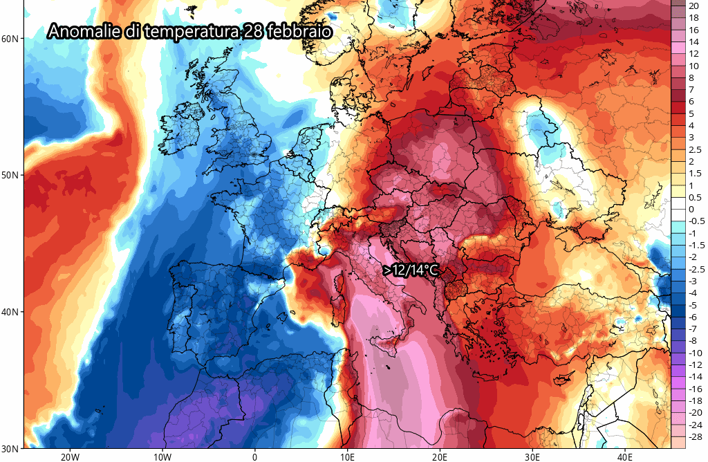 Tuttavia in questa simulazione del modello americano i contrasti sono troppo estremi, come si evince dalle anomalie previste il 28 febbraio. Addirittura il richiamo mite generato dalla perturbazione sarebbe talmente potente da far impennare le temperature di almeno 12-14°C sopra le medie del periodo: insomma potremmo registrare temperature fino a 25-27°C su centro e sud Italia.