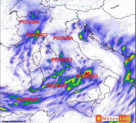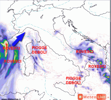 Rovesci piuttosto intensi saranno presenti sulla Liguria, sul Lazio e la Campania. Rovesci anche nel sud-est della Sardegna e il nord della Calabria. Piogge sul resto del nord-ovest, sull’Emilia Romagna e sulla Sicilia, per il resto tempo asciutto o con piogge più deboli. Neve sopra i 1400-1500 metri sulle Alpi occidentali. Temperature in calo specie al nord e al centro.