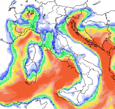 Segnaliamo che su alcune aree della Campania sarà quasi certa (in arancione), poichè la mappa mostra una probabilità di pioggia superiore al 95%, molto probabile anche su alto Pçiemonte e alta Lombardia e sull’estremo sud della Sardegna.