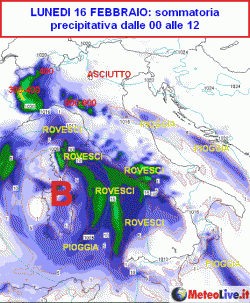 La prima cartina ci mostra la sommatoria delle precipitazioni attese in Italia tra la mezzanotte e le 12 di lunedì 16 febbraio.