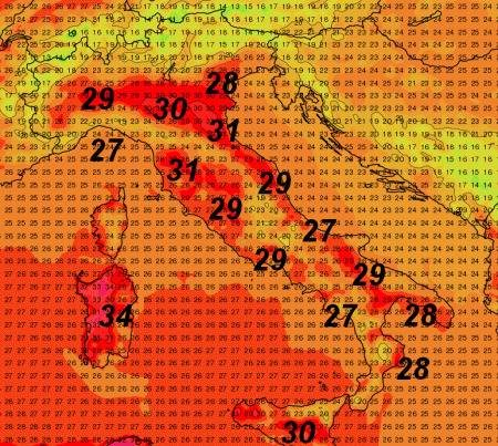 Punte di 34° saranno possibili in Sardegna; 31° sulla Romagna e 30° in Sicilia e sul Veneto. Altrove valori praticamente ovunque superiori a 25°.