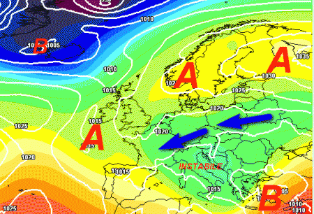 Si notano poche differenze rispetto alla circolazione sperimentata in questi ultimi giorni. L’alta pressione sarà sempre distesa tra la Scandinavia e le Isole Britanniche e offrirà il fianco meridionale a correnti orientali moderatamente fredde (frecce blu) che come una lama nel burro si infileranno nel calderone mediterraneo.