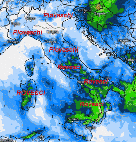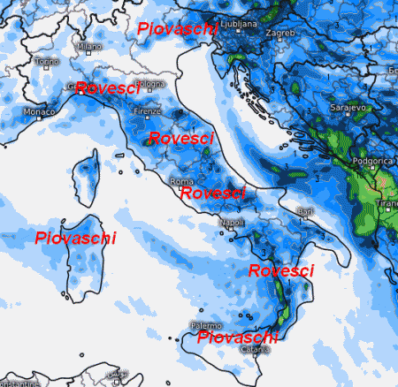 Piovaschi o rovesci si attiveranno su buona parte del Paese, specie nelle ore pomeridiane e nelle aree interne. Fenomeni meno probabili sulla Pianura Padana, sulla Sardegna meridionale e la Sicilia.