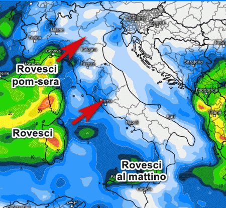 La mattinata partirà con il sole quasi ovunque a parte gli ultimi rovesci tra il nord della Sicilia e il sud della Calabria, ma in attenuazione. In giornata assisteremo ad un aumento della nuvolosità medio-alta al nord e sulla Sardegna. Tra il pomeriggio e la sera le prime piogge al nord-ovest ed in Sardegna, in progressiva intensificazione nella notte. Da segnalare anche le prime nevicate sulle Alpi centro-occidentali sopra i 900-1000 metri.