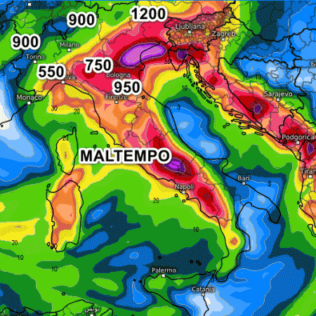 Maltempo quasi ovunque con piogge e rovesci anche intensi dove vedete il colore tendente al rosso sulla mappa. Attenzione alle nevicate al nord: tra il basso Piemonte e l’Appennino Ligure occidentale i fiocchi potrebbero scendere fino a 500-600 metri; tra i 750m del Piacentino e i 1.000 metri sul restante Appennino settentrionale; 900-1200 metri sulle Alpi procedendo da ovest verso est. Il tempo inizierà a migliorare a partire dal nord-ovest e la Sardegna nella seconda parte della giornata di martedì.