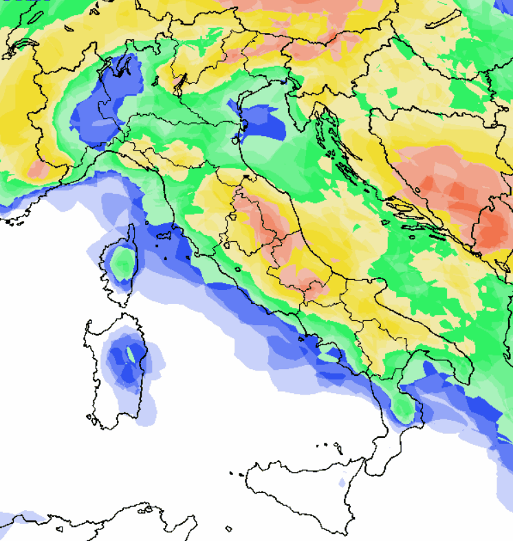 Notiamo l’assenza di alta pressione sul Mediterraneo. L’Italia verrà abbracciata da una blanda depressione alimentata da aria più fresca proveniente dai quadranti orientali. Le condizioni meteorologiche, con una situazione del genere, non potranno essere stabili sul nostro Paese. Infatti, la mappa della probabilità di pioggia a scala italica imbastita questa mattina dal modello americano mostra una situazione tutt’altro che stabile. ( vi ricordiamo che: in blu probabilità di pioggia bassa (sotto al 25%), in verde medio-bassa (fra 25 e 50%), in giallo medio-alta (fra 50 e 75%) e in rosso alta o molto alta” (oltre il 75%).