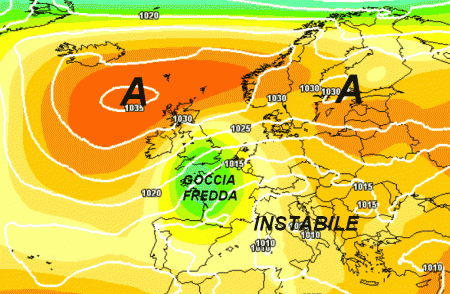 All’inizio della settimana prossima invece l’alta pressione potrebbe defilarsi ulteriormente e consentire il travaso di una nuova goccia fredda che dall’Europa settentrionale si porterà verso la Francia. La nostra Penisola verrà quindi interessata da condizioni di forte instabilità che specie al nord e al centro potrebbero causare temporali anche forti.