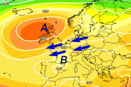 Alta pressione con massimo addirittura tra la Scozia e l’Islanda. Sul suo bordo meridionale correnti fresche tra est e nord-est che si getteranno nel calderone mediterraneo contribuendo a rinnovare l’instabilità atmosferica in loco.