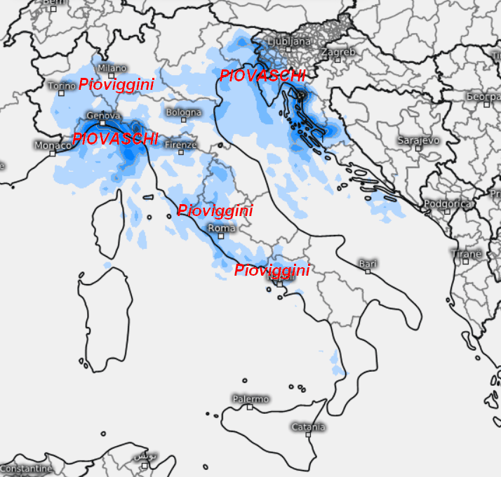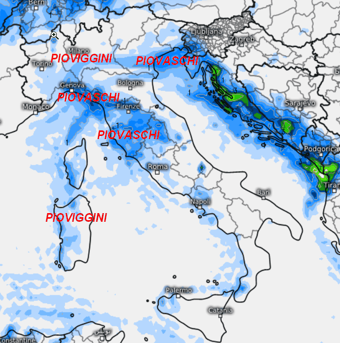 Piovaschi sparsi tra Liguria e Toscana, non che tra le coste venete e giuliane. Pioviggini su Sardegna occidentale, Tirreno centro-meridionale e medio-bassa Val Padana, per il resto tempo asciutto. Clima sempre mite.
