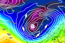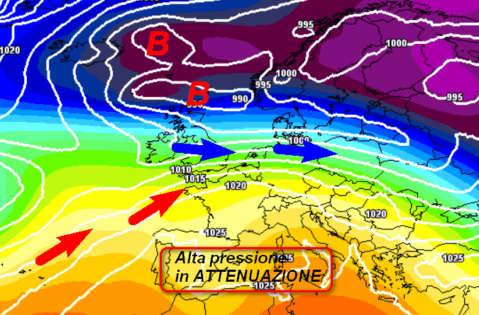 Pur restando ancora in un contesto di pressione piuttosto elevata sul Mediterraneo, l’anticiclone inizierà a mollare la presa; lo si nota dai colori non più tendenti al rosso, ma al giallo sbiadito, chiaro segno di una diminuzione dei geopotenziali in quota. Notate inoltre il flusso atlantico, che da nord e da ovest opererà un lento lavoro di erosione ai danni dell’anticiclone medesimo, che verrà sconfitto definitivamente solo nella seconda parte della settimana.
