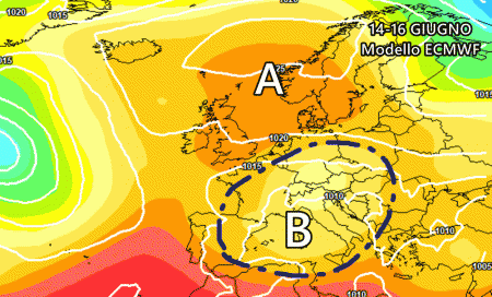 Il modello europeo ECMWF è quello al momento più prolifico in termini di precipitazioni e intensità del fresco. Il rinforzo dell’alta pressione tra Scandinavia e Gran Bretagna favorirebbe la discesa di vasti flussi freschi verso il cuore del Mediterraneo, dove scaverebbero una depressione persistente. Insomma non il massimo per il pieno di Giugno, considerando che vivremmo giornate più grigie e molto instabili.