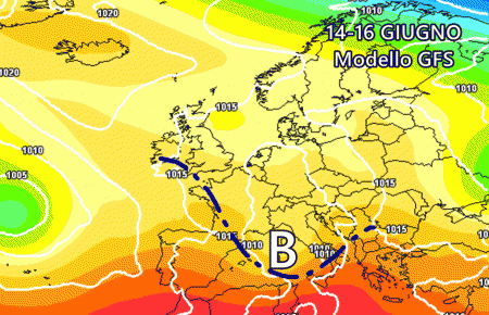 Anche l’americano GFS propone il transito di una depressione colma di temporali e acquazzoni tra 14 e 16 Giugno, ma con modalità differenti rispetto a ECMWF. In questo scenario avremmo fenomeni più rapidi senza grandi sbalzi di temperatura.