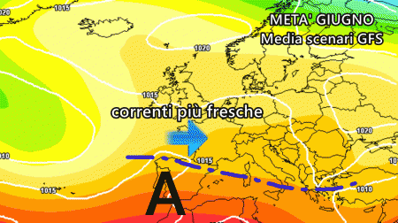 Il rischio di questa nuova fase instabile c’è e occorre sottolinearlo anche con la mappa della media degli scenari. L’alta pressione è dormiente, rintanata sul nord Africa a metà mese, mentre le correnti più fresche occidentali riescono ad avere la meglio sull’Italia.