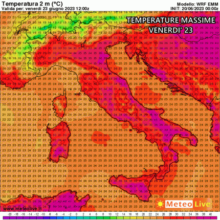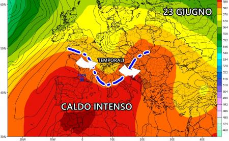 Difatti venerdì 23 Giugno sarà proprio questo il rischio principale sulle regioni del nord! Il cavo d’onda proveniente da ovest impatterà su un tappeto di aria calda e umida, un vero e proprio serbatoio di energia per lo sviluppo di forti temporali. Le temperature di venerdì, infatti, saranno ancora parecchio alte anche sul settentrione.