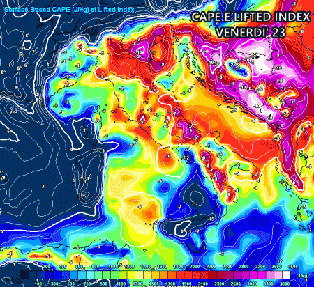 Analizzando la mappa dei valori energetici, possiamo notare come nel pomeriggio di venerdì abbiamo altissimi valori di CAPE e Lifted Index sul Nordest. In rosso e viola possiamo notare quantitativi di energia disponibile davvero clamorosi, addirittura superiori ai 2500 J/Kg. Un CAPE così elevato è spesso indice di fortissima instabilità e da tutta questa energia possono svilupparsi temporali violenti ricchi di grandine e forti colpi di Veneto.