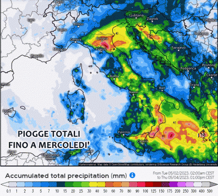 Ma attenzione: non sarà solo il sud a fare i conti col maltempo! Le precipitazioni proseguiranno in maniera insistente fino alle prime ore di mercoledì anche sul medio-alto Adriatico. Eloquenti gli accumuli previsti fino a mercoledì, con punte superiori ai 100 mm in Emilia Romagna!