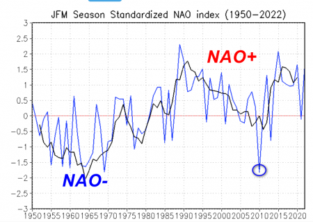 In questa situazione il vortice polare è forte, sull’Islanda possono svilupparsi potenti cicloni che vagano poi per il nord Europa (fase di NAO+ può correlarsi dunque facilmente con una fase di AO+).