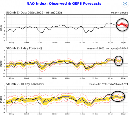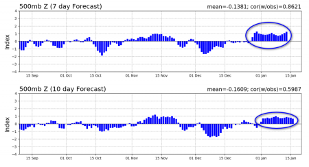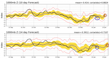 E come si sta comportando ora questo indice secondo voi? E’ alto vero? Già, sinonimo di vortice polare bello compatto. E come si prevede che si comporti sino a metà gennaio? In lieve e temporaneo calo ma sempre bello alto, sintomo di un vortice polare compatto e agitato, come vedete qui sotto, addirittura in ripresa temporanea per metà mese: