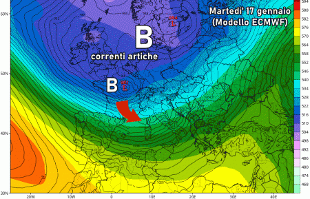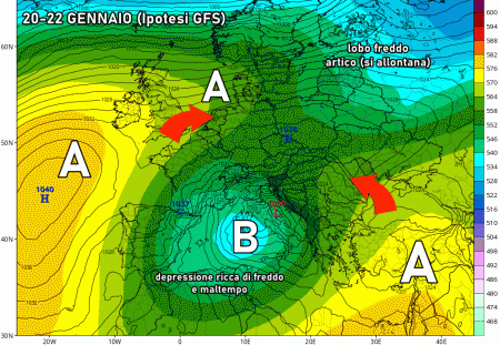Il lobo freddo che avvolgerà l’Europa tra 15 e 18 gennaio potrebbe muoversi rapidamente verso est, sotto la spinta dell’anticiclone delle Azzorre a sua volta intenzionato a muoversi verso l’Europa centro-settentrionale. In questo modo la saccatura meridionale di questo vasto lobo freddo si ritroverebbe chiusa in una morsa da due anticicloni (quello azzorriano ad ovest e quello sub-tropicale ad est (che interesserà i settori del Mediterraneo orientale). Questa chiusura a tenaglia costringerà una parte del lobo freddo ad isolarsi nel Mediterraneo dando vita ad uno dei più classici "cut-off". È il modello matematico GFS a mostrare questa ipotesi già da diversi aggiornamenti per il periodo tra 20 e 22 gennaio.