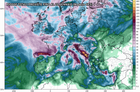Questo cut-off sarebbe caratterizzato da una profonda depressione alimentata dall’aria fredda artica, con conseguenze decisamente importanti lungo lo Stivale. In tal caso avremmo tante piogge, temporali e forti acquazzoni su buona parte della penisola, in particolare al centro, al sud e sulle isole maggiori. Contemporaneamente le nevicate diverrebbero copiose e persistenti lungo tutto l’Appennino fino a quote interessanti. Difficile parlare di neve in pianura in questa circostanza, considerando che verrebbe comunque a mancare la componente gelida continentale dell’est Europa. Eloquenti le piogge previste fino al 22 gennaio dal modello GFS, davvero abbondanti su tutto il settore tirrenico e in Appennino:
