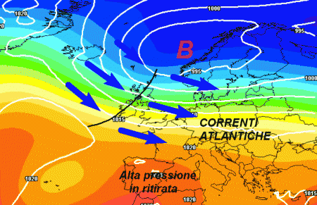 Qualche segno di cambiamento inizia a trapelare da questa mappa. Notate l‘alta pressione in fase di ritiro verso sud-ovest e le correnti atlantiche che saranno maggiormente agguerrite ed intenzionate ad interessare quantomeno il centro-nord della nostra Penisola.