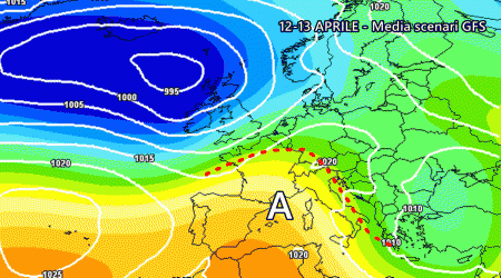 Addirittura la media degli scenari dello stesso modello americano non crede in questa evoluzione di stampo nord-atlantico. Anzi, propone l’esatto opposto nel periodo 12-13 Aprile, con l’anticiclone delle Azzorre in repentino rinforzo su tutta Italia ed un aumento delle temperature.