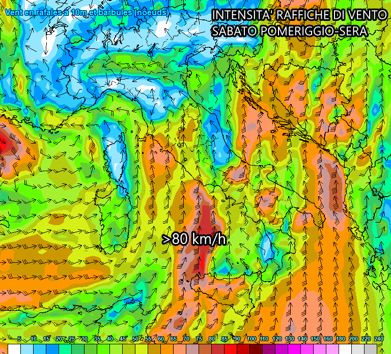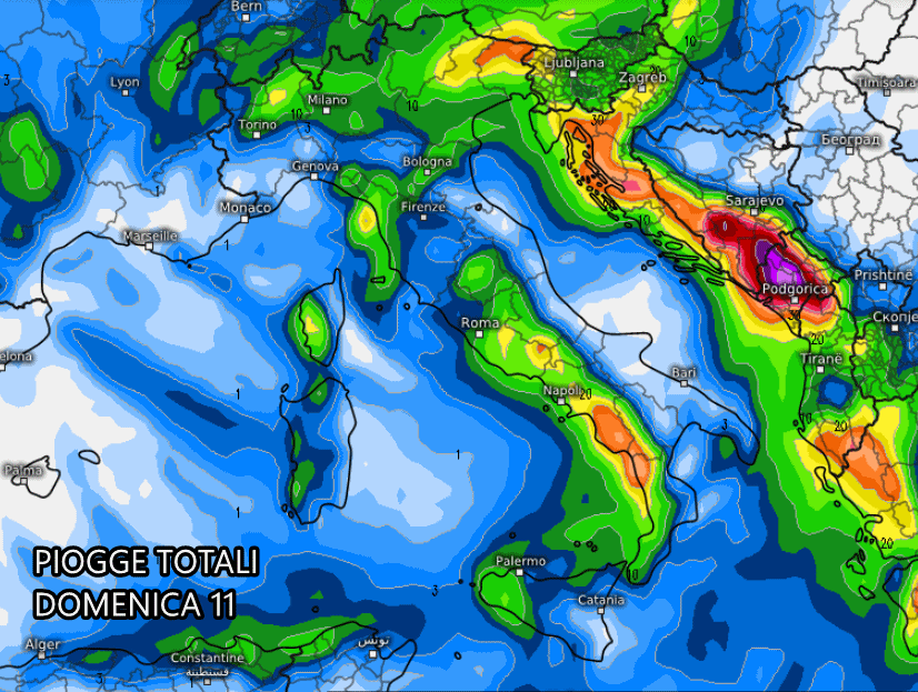 Le piogge continueranno a bagnare tutto il nord e nel frattempo si estenderanno a gran parte del lato tirrenico. Tra pomeriggio e sera, inoltre, potrebbe svilupparsi un vasto sistema temporalesco alimentato dai forti venti di scirocco: questi temporali, ubicati sul basso Tirreno, potrebbero attraversare lentamente tutto il sud Italia partendo da Sicilia e Campania.