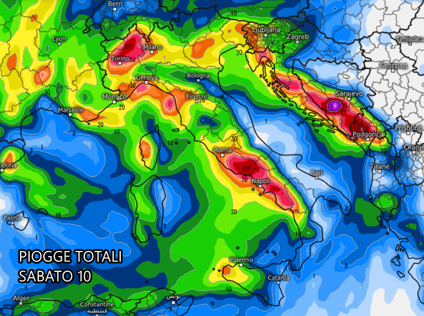 Anche la giornata di domenica sarà molto perturbata da nord a sud, con piogge diffuse, locali rovesci e ancora una ventilazione sud-occidentale abbastanza tiepida. Con queste temperature così alte è chiaro che la neve potrà scendere solo in alta montagna.