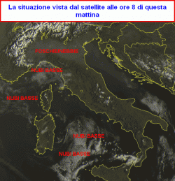 La prima mappa mostra la situazione di questa mattina in Italia vista dal satellite (alle ore 8). Sulle pianure del nord sono visibili foschie e qualche banco di nebbia associato ad un peggioramento della qualità dell’aria specie nelle grandi città.