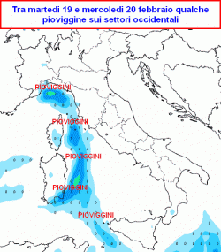 Pioverà? Come abbiamo accennato, qualche locale pioviggine si potrà avere sui settori occidentali tra martedi 19 e mercoledi 20 febbraio, ma si tratterà davvero di poca cosa.