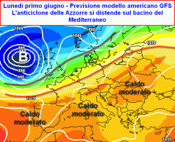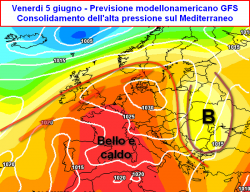 Spingendoci sulle lunghe distanze previsionali, il modello americano conferma il mantenimento dell’anticiclone sul Mediterraneo, il quale potrebbe influenzare gran parte della prima decade di giugno, La persistenza di tale situazione sul bacino del Mediterraneo, porterebbe ad un inevitabile, graduale aumento delle temperature sia al suolo che alle quote superiori. Questo aumento termico viene messo in risalto dalla risalita dei geopotenziali alla quota di 500hpa (circa 5500 metri). Come diretta conseguenza, aumenterebbero i processi di compressione adiabatica all’interno dell’anticiclone, l’aria tenderebbe a surriscaldarsi nei bassi strati atmosferici.