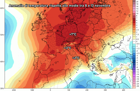Per il resto avremo ben poco di cui parlare, se non del nuovo aumento termico come evidenziato dalle anomalie di temperatura previste tra 8 e 13 novembre. L’aumento termico più importante sarà al nord, dove saliremo oltre le medie del periodo di almeno 3-4°C.
