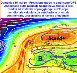 L’imposizione di questo pattern oramai giunti nel cuore della primavera meteorologica ed all’esordio di quella astronomica, porterebbe nulla più che a una lunga parentesi d’instabilità. Tempo incerto e piuttosto freddo per la stagione, che esordirebbe con l’intervento di una circolazione orientale, concludendosi con l’ingresso dei venti occidentali entro la fine di marzo. Il contesto termico, specie inizialmente, sarebbe caratterizzato da temperature sotto la media del periodo, effetto indotto da una circolazione eolica di natura continentale.
