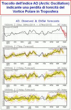 Era logico che tale situazione non potesse durare a lungo, le nuove previsioni evidenziano infatti un vero e proprio "crollo" degli indici AO (Arctic Oscillation) e NAO (North Atlantic Oscillation) che mettono se possibile ancora più in risalto un tracollo nella tonicità del Vortice Polare che riguarderà già questa seconda decade di marzo. Stiamo quindi assistendo a due comportamenti opposti dell’atmosfera, entrambi concentrati nell’arco di pochissimo tempo l’uno dall’altro, dapprima un rinforzo anomalo del vortice, poi ad un suo violento collasso con effetti imprevedibili sulla circolazione generale atmosferica delle medie latitudini.